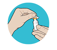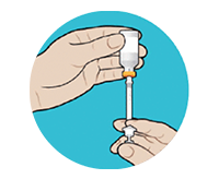 Check the flow of the medication by dialing two units. With the needle facing up, press the thumb button until you see a drop of medication. If necessary, repeat until you see a drop of medication.