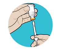 With the syringe still in the bottle, turn the vial and syringe upside down. The tip of the needle should be fully covered by insulin.