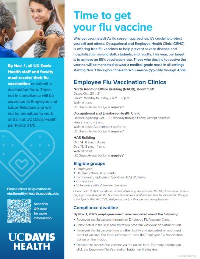 The Nov. 1 compliance deadline for UC Davis Health’s annual flu vaccination policy has officially passed, marking the start of enforcement measures designed to protect our community during flu season. As of Nov. 4, 85.53% of employees have complied with the policy.