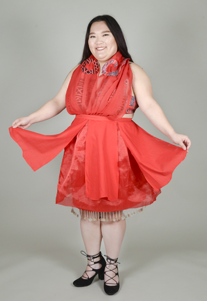 Designer’s statement: “Valentina” is a unique garment that brings awareness to heart disease as the leading cause of death in women through its color and structure. A knee-length red cotton dress with thin layers of red chiffon draped from shoulder to hem, “Valentina” embodies its message prominently through its structure. Layers of chiffon wrap around the body from the left shoulder of the Although these fabrics may have different properties that create a different look to the garment, the color is the same, demonstrating its relevance to the context this dress portrays. The color red is often associated with the heart and the blood that pumps through the heart. Therefore, the use of red fabrics for the entirety of this dress draws a connection between the dress and the message being portrayed. Through these different design elements, “Valentina” — Italian for “brave” — embodies the strength, bravery and confidence that goes into fighting a disease such as heart disease