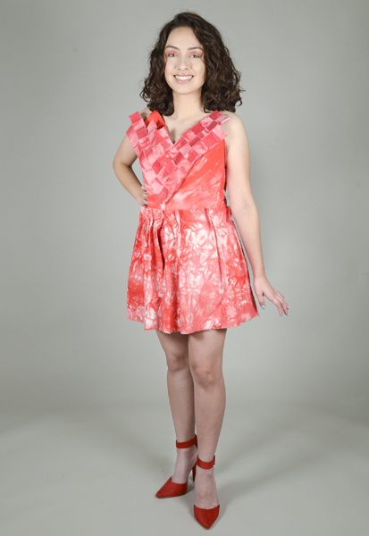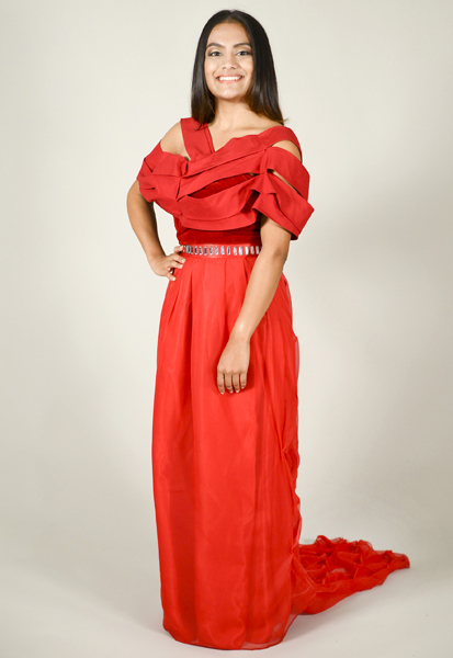 Designer’s statement: I made this red dress for all innovative and modern young women. It was inspired by the sophisticated architecture that surrounds us, including the surface textures, balconies and details in the windows. The arches in buildings inspired me to reflect elegance with a touch of playfulness and fierceness into my design. The dress has a very classic silhouette with details that represent the architectural aspects of our cities. It defines a young women who has been living a healthy and fun life. My dress was also intended to raise awareness of women’s heart health. Our hearts represent love, and love is one of the most valuable feelings that we can experience. |
