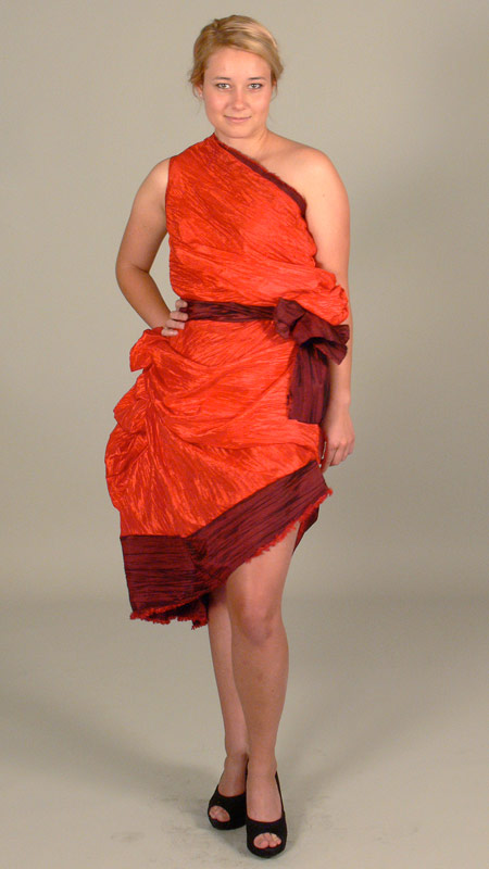 Designer’s statement: “Matters of the Heart” represents the confident, determined and energetic women of modern times, yet the eccentric design was highly inspired by the clothing worn by great Roman and Greek women. The objective of this dress is to raise consciousness and awareness of heart disease. Many people believe that colors possess healing powers and that red holds the property to stimulate low pressure. Red is the heart, as is the color of this dress. I chose a circular metal ring and carefully located it on the left upper part of bodice where the heart is to represent life and the importance of taking care of our health. Metal is strong, as should be our heart’s life. The circular metal is symbolic as it ties in all the aspects of the dress just as the matters of the heart, which embodies all the organs within our bodies. Organza pleats in the front and back of the dress branch out from the ring represent our body’s circulatory system. The shimmery glitter of the organza fabric represents the millions of cells that course through our body. This elegant design shows the vibrant life of a strong heart and emphasizes the beauty of it in its natural state that must be maintained through health care.