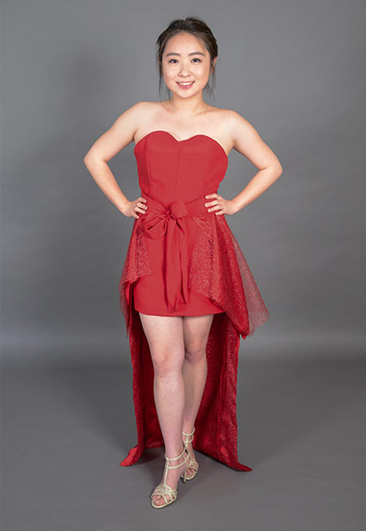 Designer’s statement: As spring approaches, flowers sprung from the ground and begin to bloom. It means that the cold, harsh winter is over and that it is time to start anew. My inspiration came from a blooming rose. The bodice of the dress is decorated with overlapping rose petals to mimic a fully bloomed rose while the lower part of the dress portrays protruding pleats, which imitates the thorns of a rose. I wanted my dress to remind people that after every winter, comes spring. I wanted “Blooming Red” to signify hope for preventing and fighting heart disease.