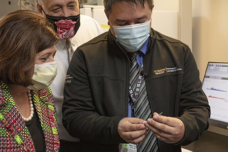 One notable collaboration between UC Davis School of Medicine and the industry is the development of a rapid COVID-19 test. The new test uses an analytical instrument known as a mass spectrometer, which is paired with a powerful machine-learning platform to detect SARS-CoV-2 in nasal swabs.